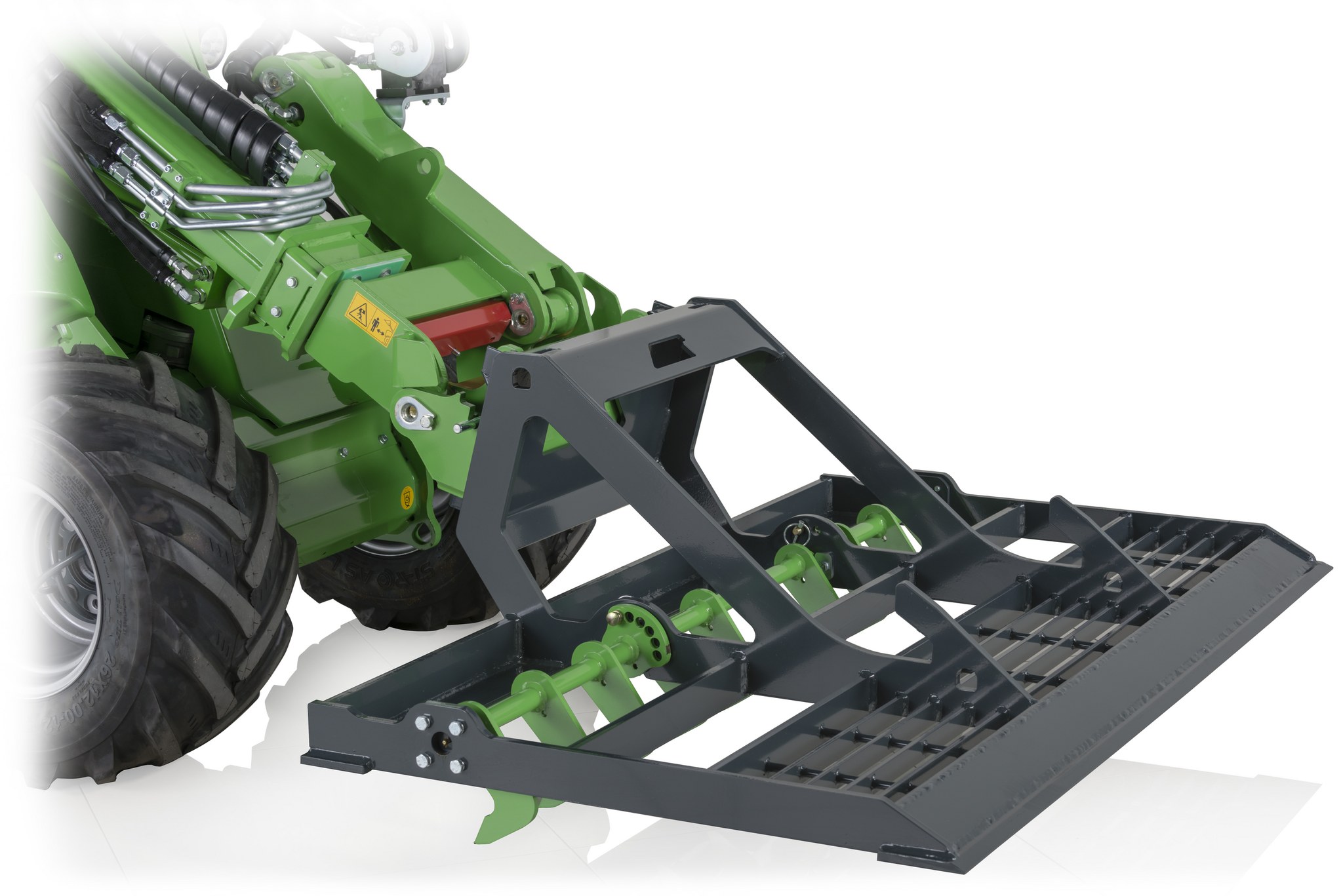 Be to, HD išlyginimo grotelės turi du kablio tipo kronšteinus priekyje, leidžiančius lengvai transportuoti kaušą ir naudoti įrangą įvairiais būdais. Galinis purentuvo strypas turi kablius ir gali būti rankiniu būdu nustatomas į penkis skirtingus darbo gylius. Purentuvo strypą galima ir pakelti, kad būtų galima naudoti nivelyrą neketinant grunto.