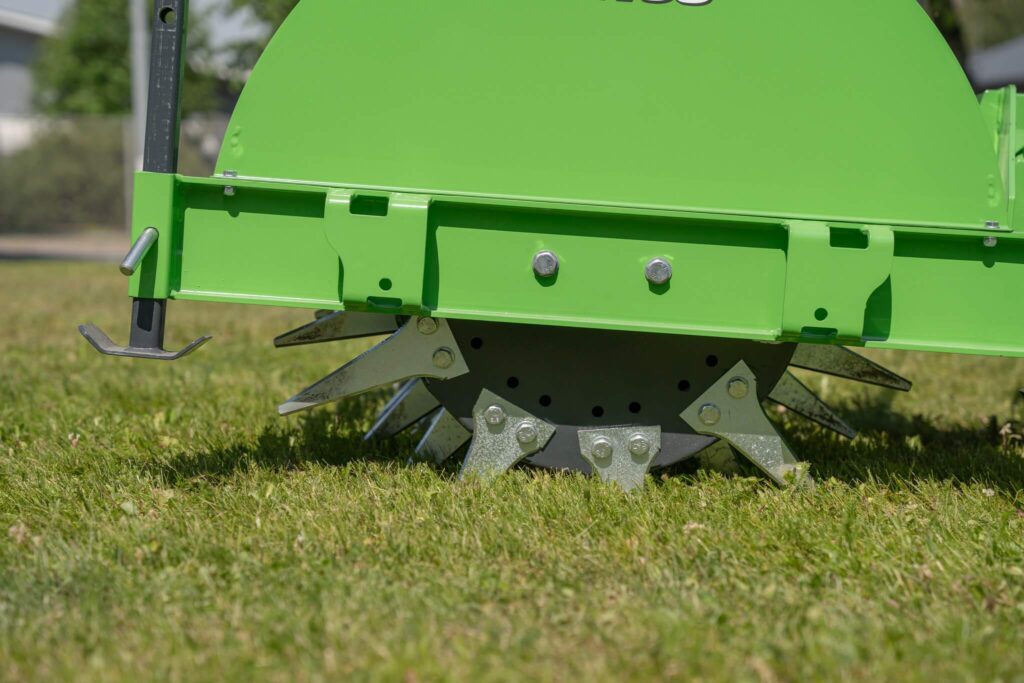 Aeratorius turi 12 eilių, kiekvienoje po 10 peilių, iš viso 120 peilių. Darbo plotis yra 1500 mm, o darbo aukštis reguliuojamas naudojant keturis atraminius ratus su nailoniniais tarpikliais. Tvirtinimo laikiklis leidžia didelę vertikalią eigą ir yra pasukamas, todėl įrenginys juda tolygiai ir sklandžiai.